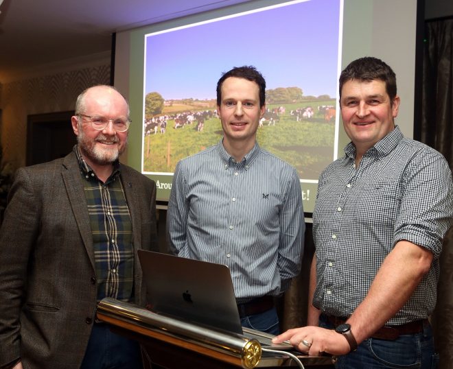 Steven Houston (right) a dairy farmer from Glaryford, Co. Antrim and guest speaker at Fermanagh Grassland Club, with (from left) William Johnston, secretary and Connor Donaldson, chairman.