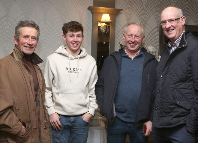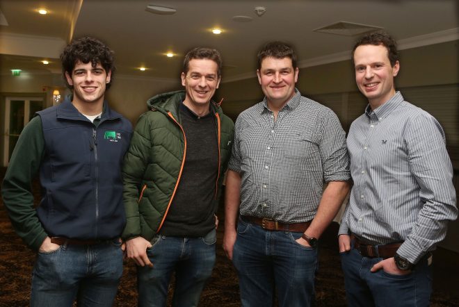 Steven Houston (second right) a dairy farmer from Glaryford, Co. Antrim and guest speaker at Fermanagh Grassland Club, with club members (from left) Alex and James Murphy, Ballyreagh and Connor Donaldson, club chairman.