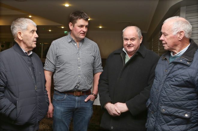 Steven Houston (second left) a dairy farmer from Glaryford, Co. Antrim and guest speaker at Fermanagh Grassland Club, in conversation with club members (from left) Val McManus, George Darling and Packie McCorry, all from Derrylin.