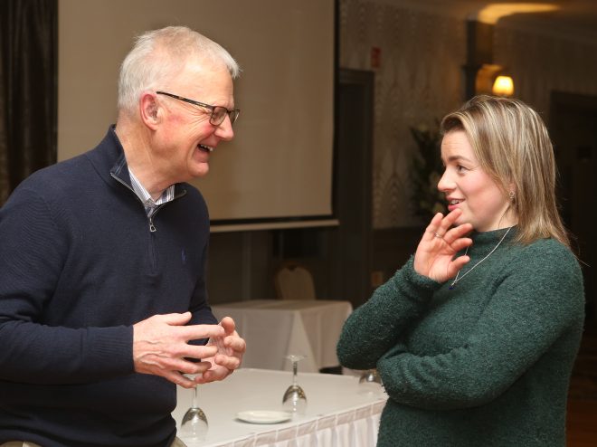 Philip Clarke, treasurer of Fermanagh Grassland Club, chatting with Jennifer Houston, wife of Steven Houston, the guest speaker at the monthly meeting of Fermanagh Grassland Club.