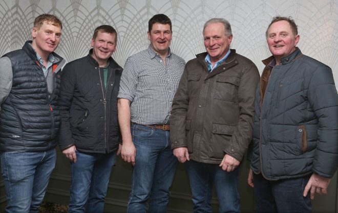 Steven Houston (centre) a dairy farmer from Glaryford, Co. Antrim and guest speaker at Fermanagh Grassland Club, with club members (from left) Gary Giles, Monea; Trevor Dunn, Brookeborough; Robin Clements, Trillick and Wayne Ferguson, Springfield.